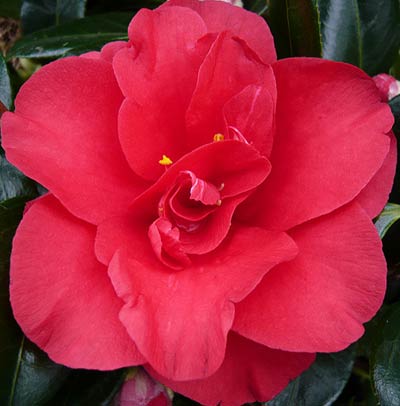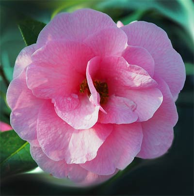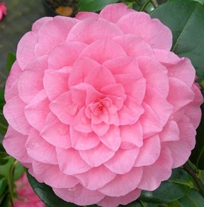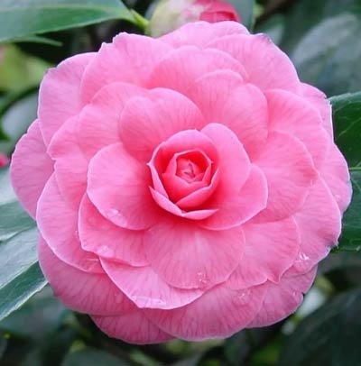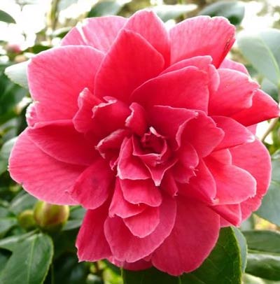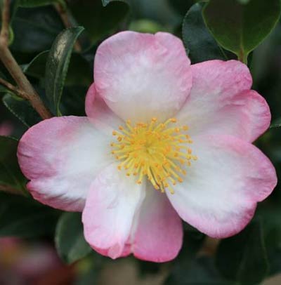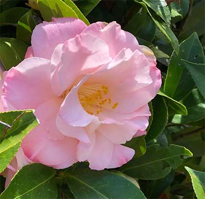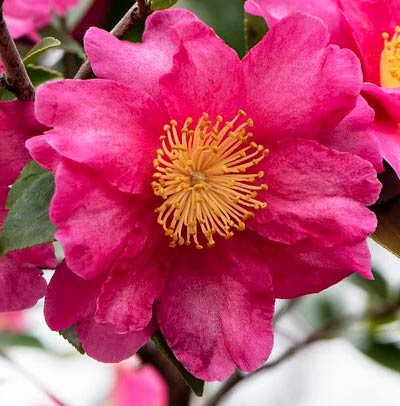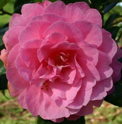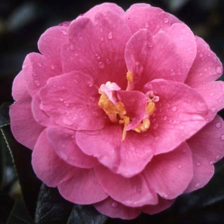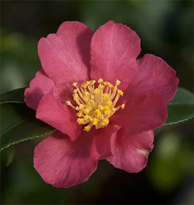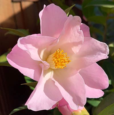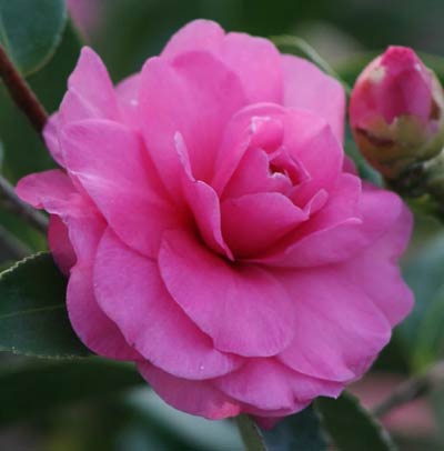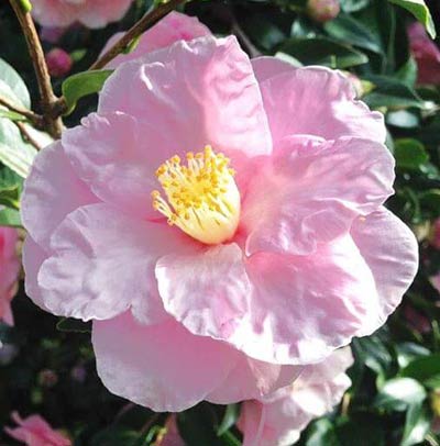 Vigorous, upright evergreen shrub with glossy dark green leaves and large scented single to semi-double pink flowers in late autumn to early winter.