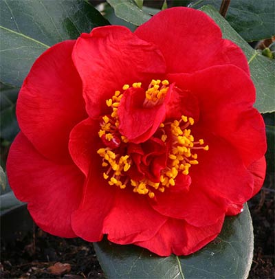 Deep crimson semi double flowers with golden stamens up to 12cm across. Autumn/winter flowering.